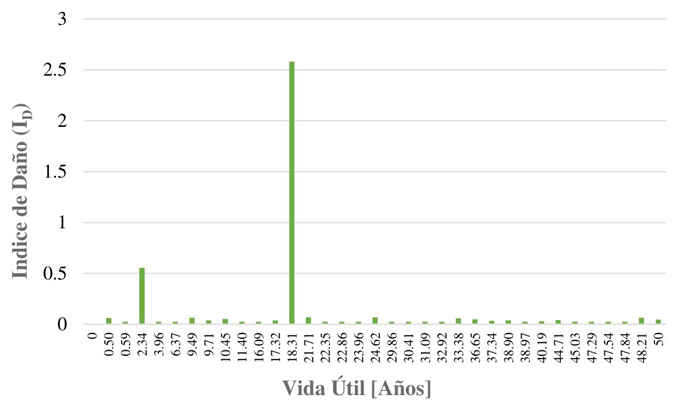 La Tabla 4 [40] muestra la escala de daños que presentan los edificios de concreto reforzado. La Figura 8 muestra los ID durante el ciclo de vida del edificio de 12 niveles ubicado en suelo con periodo Ts=2.0s y diseñado con la combinación #1, donde a partir del análisis de capacidad se obtuvo el estado límite de servicio δy =0.0018 y el estado límite de colapso δu =0.0356.