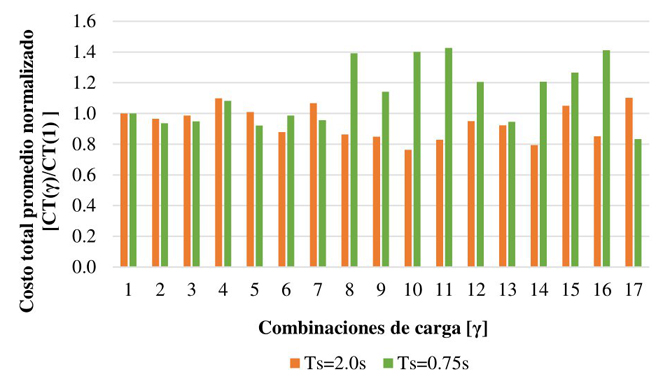 El análisis de los costos totales de los edificios diseñado con las diferentes combinaciones mostró una mejora considerable en los costos de los edificios con respecto a los edificios diseñados con la combinación reglamentaria. Los edificios ubicados en suelo con periodo Ts=0.75s diseñados con la combinación #13, obtuvieron un ahorro aproximadamente del 10% en comparación con la combinación prescrita en el reglamento. Por otro lado, los edificios ubicados en suelo con periodo Ts=2.0s diseñados con combinación #11 mostraron un ahorro cercano al 20%.