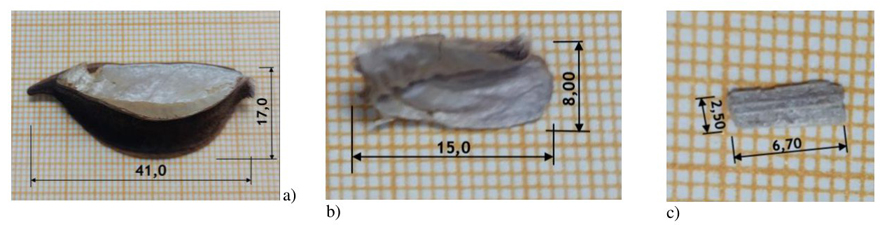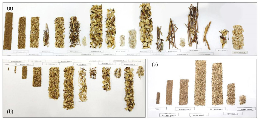 Luego de esta primera molienda y tamizado, se procedió a una segunda molienda del material utilizando una criba de 3,5 mm, obteniendo una distribución de partículas más uniforme, que también fue utilizada para la confección de paneles monocapas de granulometría fina, con un tamaño máximo de partículas de 4,75 mm (Figura 2c). Para las partículas se practicó una caracterización granulométrica, analizando el material resultante de las moliendas mediante dos procedimientos, uno a través del paso por tamices y el otro de forma manual, separando cada tipo de partículas presentes teniendo en cuenta sus características morfológicas (Figura 2). En la tabla 1 se puede observar la granulometría del material grueso y fino utilizados para la elaboración de los tableros.