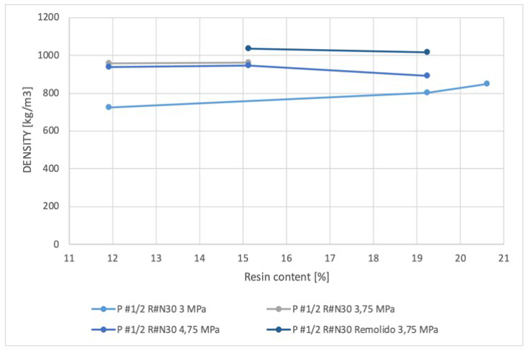 El tamaño de las partículas que componen los aglomerados tiene influencia sobre la densidad medida, ya que las placas conformadas por partículas resultantes del remolido con la criba de 3,5 mm resultan tener una mayor densidad que las placas de material molido con criba de 16mm, aún para menor presión de moldeo. Este efecto puede atribuirse a la posibilidad de alcanzar una mayor compactación debido a que las partículas finas y planas pueden acomodarse mejor en el prensado y generando una menor presencia de vacíos [34]. El contenido de resina urea formaldehído no tiene mayor incidencia en la densidad de los aglomerados.
