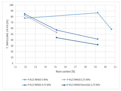 Los requerimientos de hinchamiento máximo a 24 h, también se establecen en la norma IRAM 9723 [33] en función del espesor del tablero para su uso en ambientes húmedos. Para espesores de 6 a 13 mm este límite máximo se fija en 17 %. Los resultados obtenidos indican que los tableros evaluados no cumplen este requisito aún cuando son elaborados con residuo de desmote fino y los mayores contenidos de resina, por lo cual su empleo queda restringido a los ambientes secos.