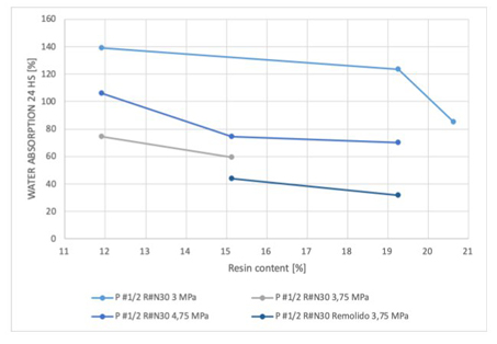 El hinchamiento a 24 hs (Figura 7) de las muestras elaboradas con residuo grueso se encuentra entre 41.5 y 86.7 %, para presiones de 3; 3.75 y 4.75 MPa de presión de moldeo. Las muestras fabricadas con presiones de moldeo de 3,75 y 4,75 MPa muestran una tendencia decreciente al incrementarse el contenido de resina, en tanto que esta tendencia no se verifica para las muestras fabricadas con 3 MPa de presión de moldeo. La absorción a 24 hs (Figura 8) de las muestras elaboradas con residuo grueso se encuentra entre 59.6 y 138.9 %, para presiones de 3; 3.75 y 4.75 MPa de presión de moldeo. Las muestras fabricadas con presiones de moldeo de 3,75 y 4,75 MPa tienen menor absorción al incrementarse el contenido de resina, en tanto que esta tendencia no resulta clara para las muestras fabricadas con 3 MPa de presión de moldeo.