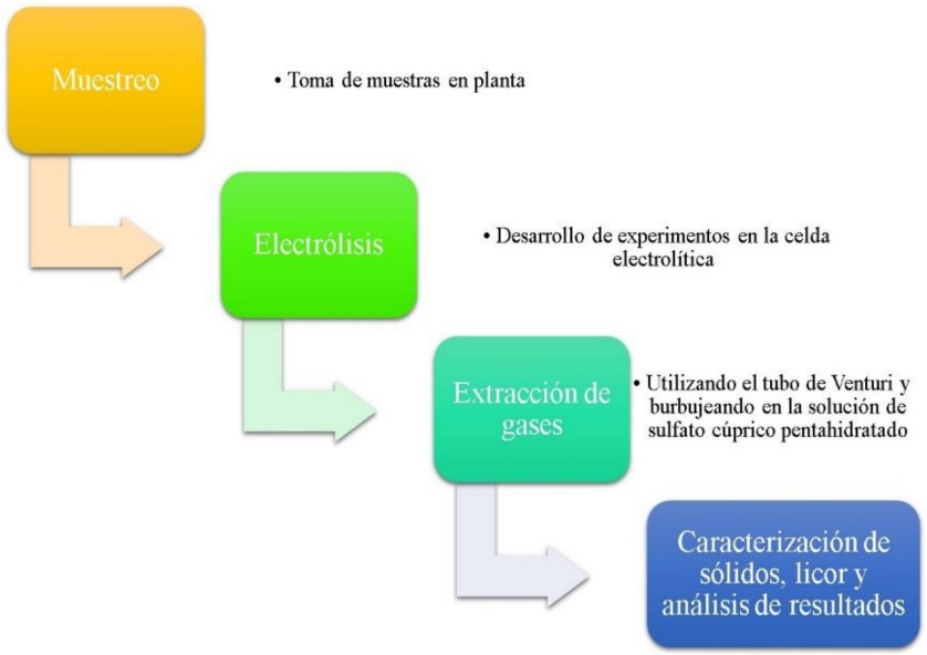 La Figura 1 muestra un diagrama de flujo, que incluye cada etapa del proceso experimental de este proyecto. En la Tabla 1 se presenta la información detallada con las variaciones de tiempo, densidad de corriente y concentración en gramos de amoniaco en el licor. Las electrólisis se realizaron debajo de una campana de extracción de gases, con una fuente de poder que alimenta a la celda, en cuanto al pH del sulfato cúprico pentahidratado y la solución de licor amoniacal se monitoreaban al comienzo y al final de la prueba. En el transcurso de la electrólisis se cerraba la válvula que conecta a la celda y al tubo de Venturi cada 5 minutos y posteriormente se abría otros 5 minutos esto para que se puedan concentrar los gases dentro de la celda y facilitara la extracción. Se trabajó con pruebas variando la densidad de corriente, para analizar el comportamiento y optimizar las condiciones de trabajo del sistema y la cantidad de gramos de hidrógeno obtenidos.