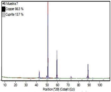 Una vez concluido el experimento, la solución de sulfato cúprico ahora reducido, fue filtrada. A fin de confirmar la teoría estequiométrica, se analizaron los precipitados generados mediante DRX. Los resultados obtenidos se muestran en la Figura 3, en donde es posible observar los resultados de DRX obtenidos, indica no solamente la presencia de cobre metálico, sino también cierto porcentaje de cuprita. Por lo tanto, fue necesario plantear, además, una ruta de oxidación del cobre generado; la generación de la cuprita puede justificarse debido a que el cobre está en presencia de aire y agua, por lo tanto, es factible su oxidación. Por lo que, para continuar con el análisis, se planteó la ec. 2, en donde se muestra que es posible oxidar al cobre generado. Los resultados de DRX indicaron que se obtenía en promedio un 84% de Cu y un 16% Cuprita (Cu2O) en el lavado del recipiente, el tubo de Venturi y la bomba. Y se obtuvo un 65.5% de Cu y un 34.5% de Cu2O directamente en el filtrado. Por lo tanto, considerando la información estequiométrica de las reacciones, y los pesos obtenidos experimentalmente, fue posible calcular los gramos de hidrógeno generados.