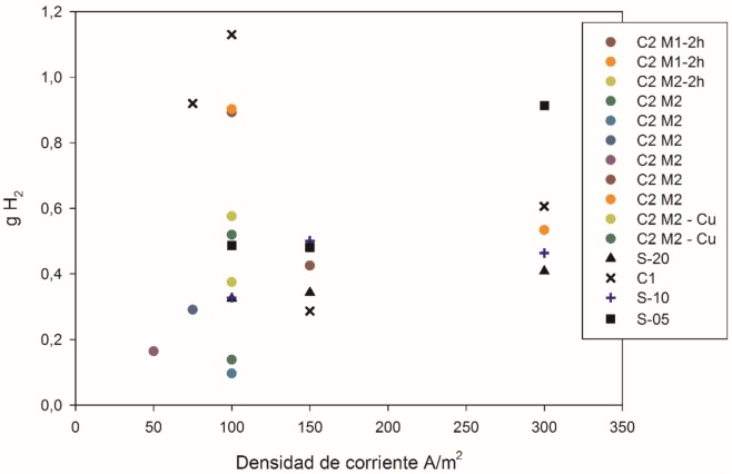 Las soluciones sintéticas analizadas tuvieron concentraciones de 5, 10 y 20 g/L, con identificación en la Figura 4 de cuadrado, cruz y triángulo respectivamente (S-05, S-10 y S-20). Los resultados indican que, a concentraciones más bajas, se tienen resultados mejores de gramos de hidrógeno obtenidos, esto puede observarse en todas las densidades estudiadas, pero tiene mayor evidencia cuando se trabajó a 300 A/m2.