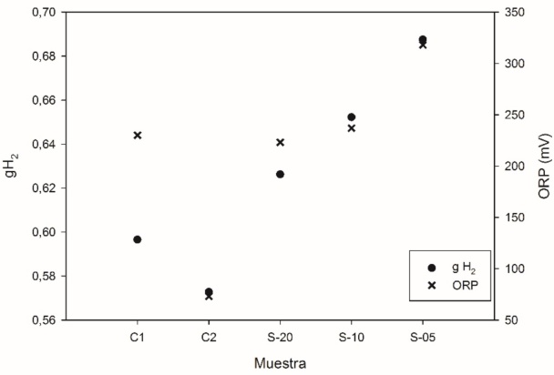 Por otra parte, en las soluciones sintéticas de 5, 10 y 20 g/L de amoniaco, se observa que a medida que se disminuye la concentración de la solución se aumenta la capacidad de obtención de hidrógeno, esto se puede relacionar directamente con el ORP de las soluciones ya que a medida que disminuye la concentración de amoniaco, este valora aumenta.
