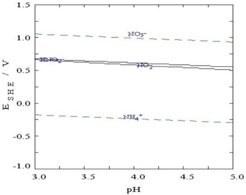 Para dar una explicación al incremento en la concentración de amoniaco al finalizar el experimento, se hace uso de la termodinámica. En todos los experimentos, se midieron tanto el potencial de hidrógeno (pH) como el potencial de oxidación-reducción (ORP). Lo cual, ha permitido plantear un fenómeno que explique el incremento en la concentración de amoniaco al finalizar el experimento. Para dicha explicación, se considera importante mencionar que el rango de pH en el cual se trabajó estuvo en el rango de 3 a 4.6; y de manera simultánea, se leyó el ORP, cuyos registros indican que se encuentran en un rango entre 0.48 a 0.85V vs SHE.