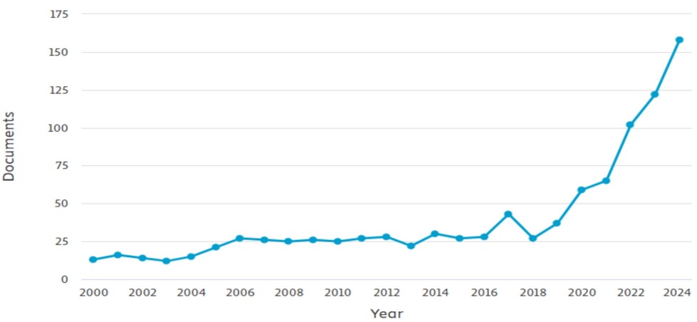 A positive correlation between publication and citation counts has been observed since 2000. While publication numbers exhibited fluctuations with periods of growth and decline from 2000 to 2018, a sustained upward trajectory in both publications and citations has been evident since 2019. Within the 2018-2023 period, citation counts have experienced a 308% increase, while a 415% growth has been observed in publication output. As of mid-2024 (WoS), the combined publication and citation output for the entire year of 2020 has already been surpassed. This growth in research output may be attributed to.