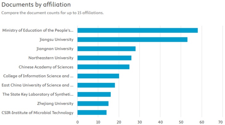Figure 5 Quantity of documents by affiliation (2000-2024) within the intersection of fermentation and AI (Scopus)