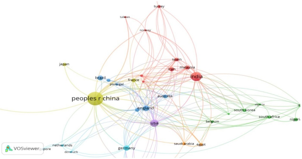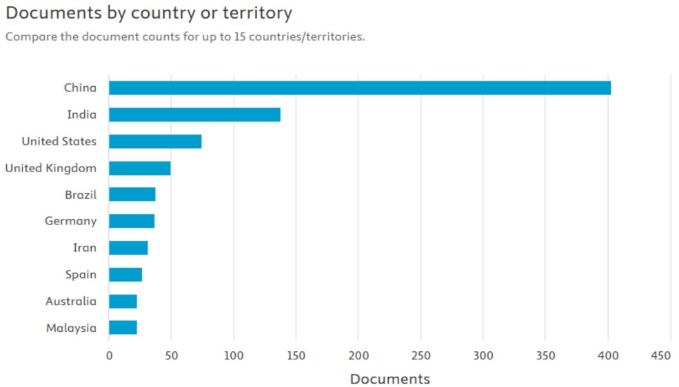 The Scopus database reflects the same publication pattern as the WoS data: the nations demonstrating the highest scientific output in terms of article peoduction in high-impact journals are China, India, and the United States. The parallel trajectory of publications and R&D investments observed in this graph suggests that China, India, and the US will likely sustain their prominence in this research domain. Likewise, these are some of the largest economies in the world.