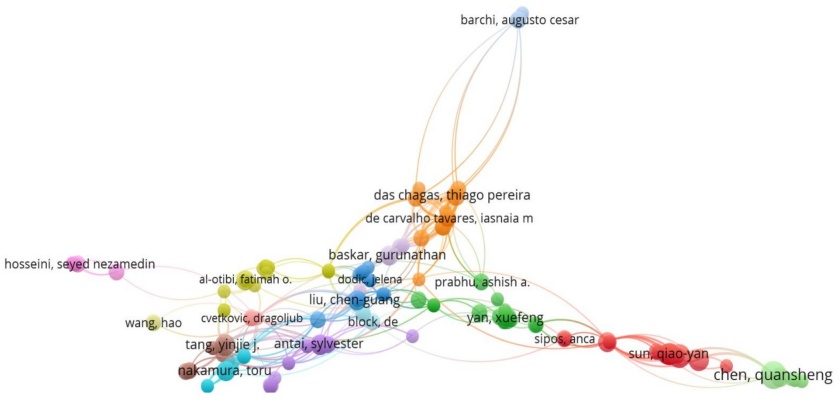 Figure 8 depicts a network of authors categorized into distinct collaborative clusters based on color differentiation. The size of each circle corresponds to the respective author's level of contibution.
