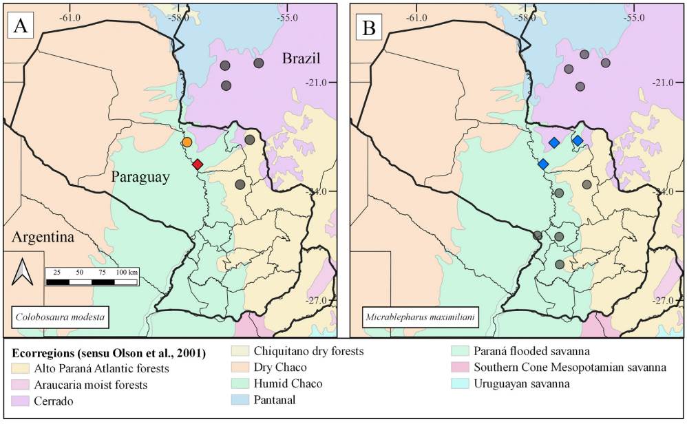 The Red-bellied gymnophthalmid Colobosaura modesta (Reinhardt & Lütken, 1862) is a small lizard previously known only for the Cerrado biome (Vanzolini & Ramos, 1977), now recorded in the Caatinga, Amazon, and Atlantic Forest in Brazil, as well as in Paraguay (sensuOlson et al., 2001; Cacciali et al., 2017; Freire et al., 2012; Martínez et al., 2020). In Paraguay, the species is only known from two localities within the Cerrado Biome, the Cerro Corá National Park in Amambay Department and Laguna Blanca Nature Reserve in San Pedro Department (Cacciali et al., 2016; Smith et al., 2016). In turn, Maximillian´s Blue-Tailed gymnophthalmid Micrablepharus maximiliani (Reinhardt & Lütken, 1862) is a small lizard known from northern Brazil to central Paraguay (Cacciali et al., 2016; Moura et al., 2010), found in open habitats in the Caatinga, Cerrado, Dry Chaco, Humid Chaco and Pantanal biomes, as well as in forested habitats such as Amazon and Atlantic Forests (Moura et al., 2010). The species is known from Central, Cordillera, Paraguarí and San Pedro Departments, associated with the Cerrado and with a transitional zone between the Atlantic Forest and the Humid Chaco biomes (Cacciali, 2010; Cacciali et al., 2016; Smith et al., 2016).