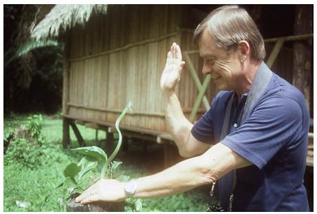 Figure 5 William E. Duellman preparing to photograph a Leptophis ahuetula at Amazonic Cusco, 30 November 1986.