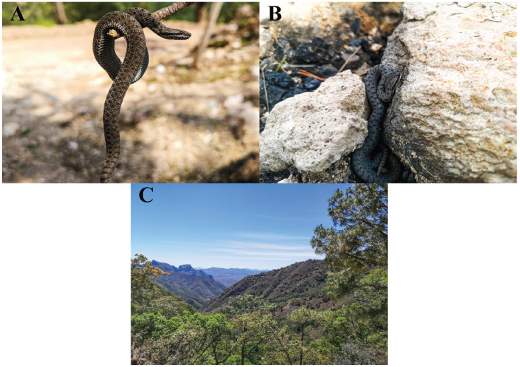 Figure 1 (A and B) First record of Crotalus pricei in Sinaloa, Mexico (MZFC 59-60) and (C) habitat where the individual was found. / Figura 1. (A y B) Primer registro de Crotalus pricei en Sinaloa, México (MZFC 59-60) y (C) hábitat donde se encontró al individuo.