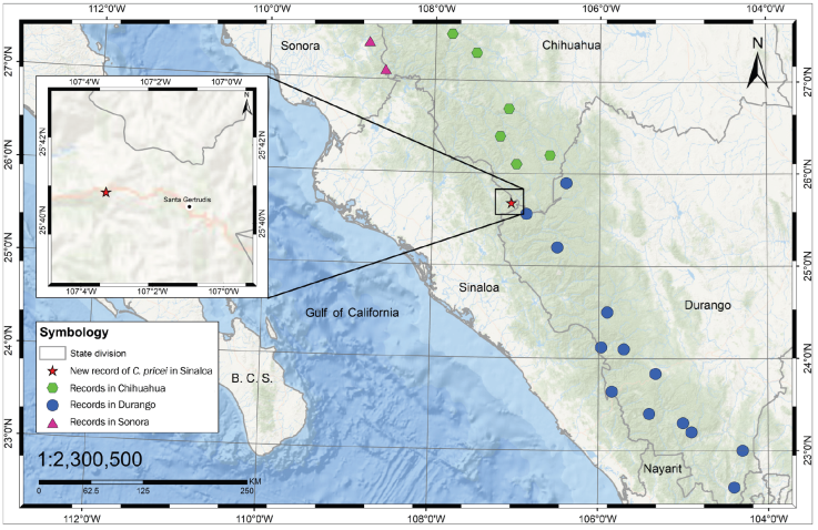 Here we document the first verified record of C. pricei in Sinaloa (Fig. 2). This new record increases the species of reptiles present in Sinaloa to a total of 122 (Lara-Reséndiz & Jacobo-González, 2022; Lemos-Espinal & Smith, 2020). The nearest previous records are in Guadalupe y Calvo, Chihuahua (45 km NNE; Lemos-Espinal et al., 2015) and Los Frailes, Tamazula, Durango (12 km SE; GBIF, 2022). Finally, this new state record indicates that more studies and citizen science projects are needed and for a detailed analysis of the distribution of Sinaloa's herpetofauna (Castro-Bastidas & Serrano-Serrano, 2022; Lara-Reséndiz & Jacobo-González, 2022; Lemos-Espinal & Smith, 2020; Loc-Barragán et al., 2020).