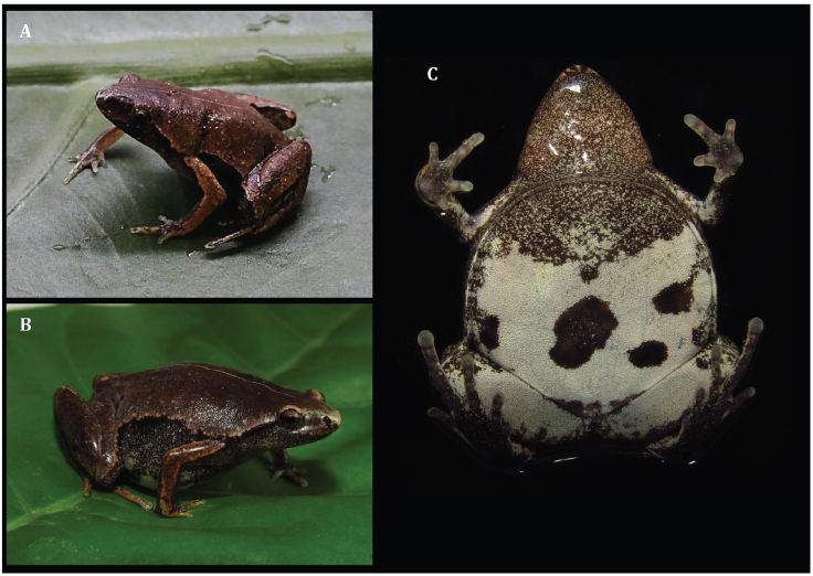 Identificación. Los individuos registrados presentan las siguientes características morfológicas: cuerpo moderadamente robusto con piel dorsal y ventral lisa; rostro corto, acuminado en vista dorsal, y truncado en su extremo anterior; ojos pequeños; tímpano oculto; extremidades cortas, moderadamente robustas con discos terminales poco prominentes en dedos de manos y pies, sin bordes cutáneos y membranas; dorso café claro o café grisáceo con una línea delgada medio-dorsal blanca, contrastando con los flancos que son café oscuro extendiéndose desde los lados de la cabeza hasta las superficies anteriores y posteriores de las extremidades. Las superficies dorsales de las extremidades presentan coloración similar al dorso (Fig. 1A, B). El vientre y superficies ventrales de las extremidades posteriores son blancas con manchas negruzcas irregulares. Garganta de color gris (Fig. 1C); el iris es color bronce con reticulaciones negras.