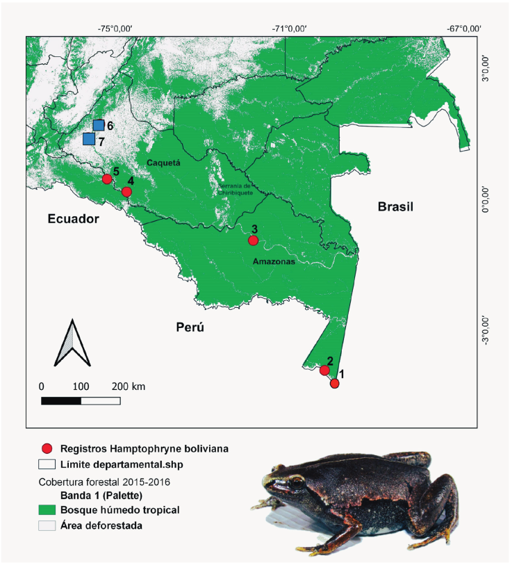 Figure 2 Map of Southeastern Colombia depicting known records of Hamptophryne boliviana in this country. Blue squares correspond to new records for the Amazonian piedmont (> 200 m a.s.l.), and red dots are former known records for the Amazonian plain (< 200 m a.s.l.). The Localities are: (1) Municipality of Leticia, Leticia-Tarapacá (Km 7) road, and Tacana River, Amazonas; (2) National Natural Park Amacayacu, Amazonas; (3) Puerto Santander, Amazonas; (4) Guitorá, Municipality of Solano, Caquetá River, Caquetá; (5) Consaya village, Municipality of Solano, Caquetá; (6) Las Dalias Natural Reserve, Municipality of La Montañita, Caquetá; (7) Azabache village, Municipality of Belén de los Andaquíes, Caquetá. / Figura 2. Mapa del suroriente de Colombia mostrando los registros conocidos de Hamptophryne boliviana en este país. Los cuadrados azules corresponden a los nuevos registros para el piedemonte amazónico (> 200 m s.n.m), y los puntos rojos son los registros conocidos para la planicie amazónica (< 200 m s.n.m). Las localidades son: (1) Municipio de Leticia, carretera Leticia-Tarapacá (Km 7) y el río Tacana, Amazonas; (2) Parque Nacional Natural Amacayacu, Amazonas; (3) Puerto Santander, Amazonas; (4) Guitorá, municipio de Solano, río Caquetá, Caquetá; (5) Vereda Consaya, municipio de Solano, río Caquetá, Caquetá; (6) Reserva Natural y Ecoturística Las Dalias, municipio de La Montañita, Caquetá; (7) Vereda Azabache, municipio de Belén de los Andaquíes, Caquetá.