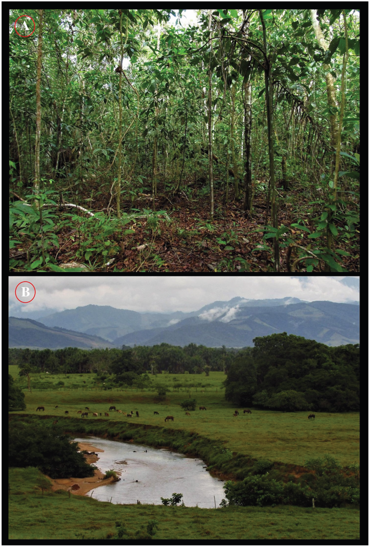 Figura 3 Hábitat de Hamptophryne boliviana en el noroccidente amazónico, departamento de Caquetá, Colombia. (A) Interior de bosque secundario con cerca de 20 años de regeneración natural, vereda Azabache, municipio Belén de los Andaquíes. (B) Vista general del paisaje en el área de estudio, resaltando el uso del suelo para ganadería, vereda Sinaí, municipio de Morelia. / Figure 3. Habitat of Hamptophryne boliviana in the northwestern Amazon, department of Caquetá, Colombia. (A) Interior of secondary forest with 20 years of natural regeneration in the Azabache village, municipality of Belén de los Andaquíes. (B) General view of the landscape in the study area, highlighting the land use for cattle ranchingat the Sinaí village, municipality of Morelia.