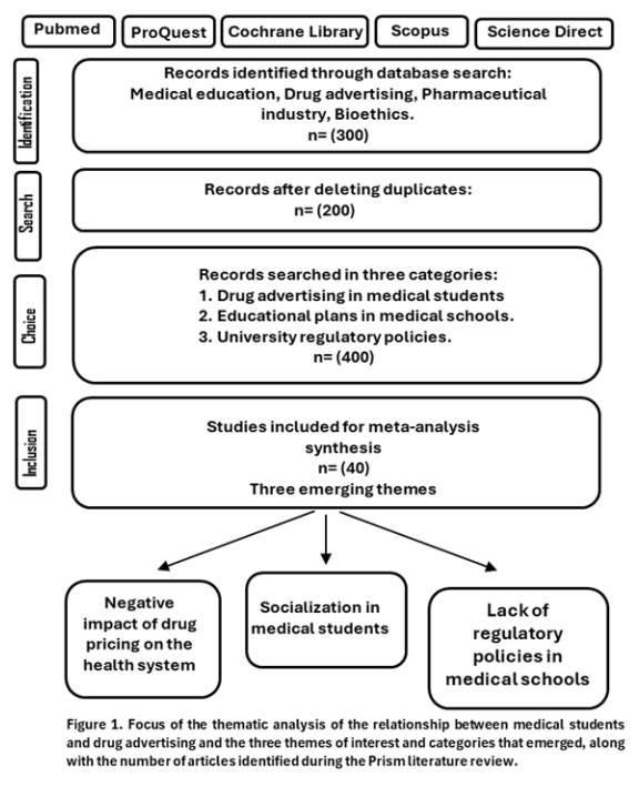 300 scientific studies were obtained from the database. After eliminating duplicate documents, 200 academic articles were examined emphasizing three categories of study: 1) drug advertising in medical students, 2) educational plans in medical schools and, 3) university regulatory policies. Of which 40 academic articles were included in the review and three relevant results emerged: 1) negative impact of drug advertising on the health system; 2) socialization in medical students; 3) lack of regulatory policies in medical schools. The data are presented below in Figure 1.