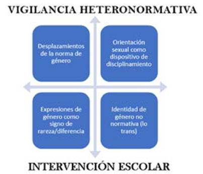 c). Identidad de género no normativa (lo queer/trans). Visto como herramienta que permita buscar las contradicciones o las incomodidades de las expresiones de género en la escuela que aparezcan como resultado de las manifestaciones afectivas y conductuales Para la comprensión de las nuevas historias o expresiones de lo masculino en la secundaria, se ubicaron dos ejes transversales que tienen presencia en la forma de clasificar e intervenir en los momentos de crisis. El primer eje es la vigilancia heteronormativa , entendida como la disposición y las formas de supervisión escolar en la producción y legitimidad de los cuerpos masculinos. Desde esta vigilancia, se trata de reconocer los niveles de autoridad en el ejercicio de poder desde la aplicación de la normativa escolar (leyes, programas, protocolos institucionales) hasta las disposiciones locales (reglamento escolar).