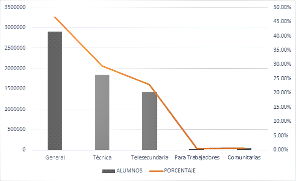 En México la educación secundaria se vuelve obligatoria a partir de 1993 y está destinada a atender a los adolescentes entre 12 y 15 años que han cursado la educación primaria. Dado el principio de gratuidad, obligatoriedad y laicidad enmarcados en la Constitución, la secundaria en México se imparte a través de los servicios de telesecundaria, técnica, general, comunitaria, para trabajadores y para migrantes (Figura 1).