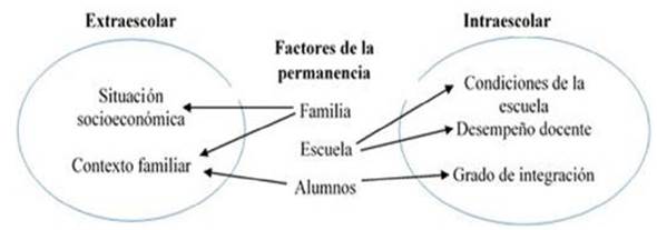 Respecto a los factores de la permanencia escolar, las diversas teorías plantean que los elementos que la ocasionan se encuentran en la Familia, la Escuela y el Alumno; mismos que pueden ser agrupados en dos marcos interpretativos: el extraescolar e intraescolar (Figura 2). En el primero se ubica la situación socioeconómica y el contexto familiar; mientras que en la segunda se ubican los aspectos inherentes al centro educativo: condiciones de la escuela, desempeño docente, grado de integración, etc. Espinoza et al. (2012).