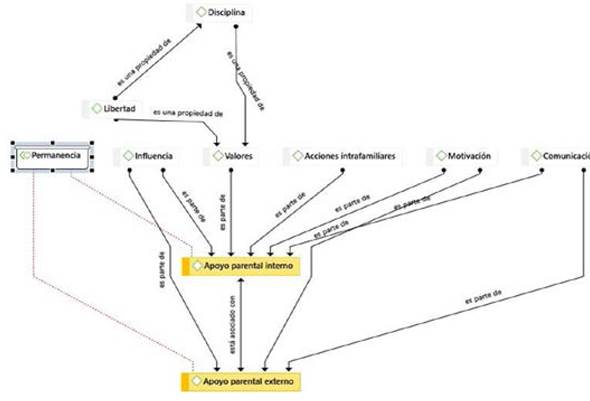 Figura 3 Red de análisis a través de ATLAS.ti8. Nota: Elaboración propia. Entendiendo al apoyo parental interno como la familia directa (padres y hermanos) y al apoyo parental externo a quienes tienen relación cercana aun no cohabitando en el mismo hogar (primos, abuelos, tíos, cuñados, etc.).