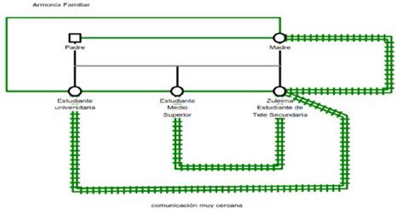 El genograma nos muestra el apoyo parental que recibe la ED, así como los vínculos estrechos con la madre. Sin embargo, es notoria la relación entre la ED y su hermana mayor quien estudia la universidad y, en menor medida, los primos por línea materna
