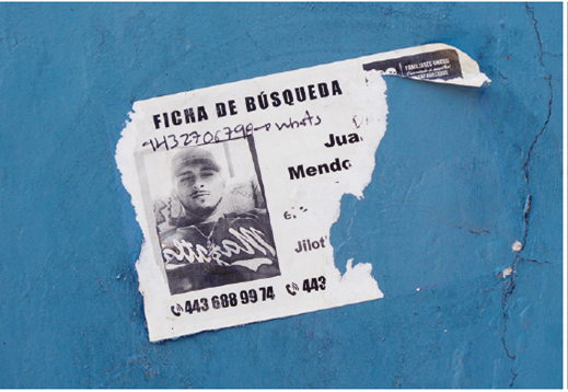 Las madres buscadoras, en la investigación realizada por Vargas, sacan de la intimidad de sus casas retratos informales, retratos que tienen “algo” en la expresión que los individualiza y que los separa de las imágenes serializadas que publica el gobierno de Jalisco. Los sacan a la vista pública lo más que pueden y así interrumpen el efecto de “una estadística más” en el paisaje urbano. Es un proyecto muy consciente que incorpora ideas de sociedad civil y opinión pública en una extensión de cuidados espirituales. En Zamora, las campañas que pegan fichas de búsqueda participan con el mismo lenguaje de denuncias y apelación a los derechos humanos como las campañas hermanas en otras ciudades de la república. Como escribe “Anónima” en un pie de foto (Imagen 1), los arrancan rápido. Pero la impresión que me da es que entre la mayoría de las familias con desaparecidos aquí, la apelación a valores civiles tampoco les resuena mucho. Sospecho que muchos hacen sus indagaciones en espacios y por redes que apenas percibo.