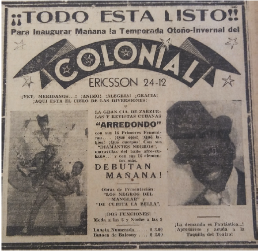 En ambos casos se trató de compañías teatrales cubanas en las que el dueño, Alfonso Rogelini, en el primero, y Enrique Arredondo, en el segundo, encarnaba el papel del negrito. Arredondo, por ejemplo, protagonizaría en diciembre de 1943 una obra descrita por el Diario de Yucatán como “cubano-yucateca”, pues junto con él participaron dos de los grandes exponentes del teatro yucateco, Héctor “Cholo” Herrera y Ofelia Zapata, en sus papeles del mestizo y la mestiza, respectivamente. La obra se llamó Tunkules y maracas; el tunkul es un instrumento maya representativo de Yucatán y las maracas, de Cuba.