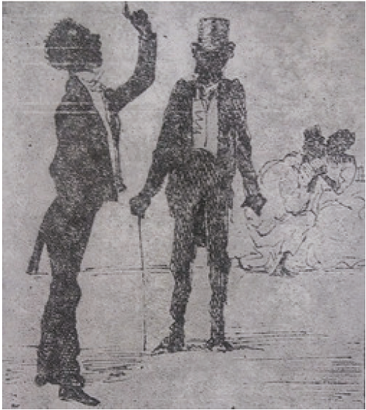 Los catedráticos representaban las aspiraciones de estos grupos por parecerse y formar parte de la sociedad blanca; por tal motivo utilizaban palabras ostentosas al hablar, aparentaban elegancia con su forma de vestir y en general rechazaban su pasado africano. Irónicamente, en su intento por imitar a las personas blancas, los negros catedráticos terminaban siendo la burla de los negros bozales, sus opuestos, y además de los propios sectores blancos, quienes reían al ver a un supuesto negro civilizado y educado de acuerdo con los estándares europeos (Frederik, 1996) (véase Imagen 7).