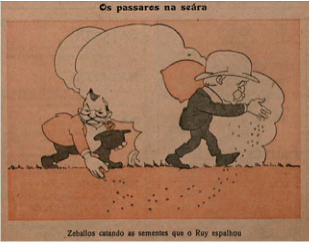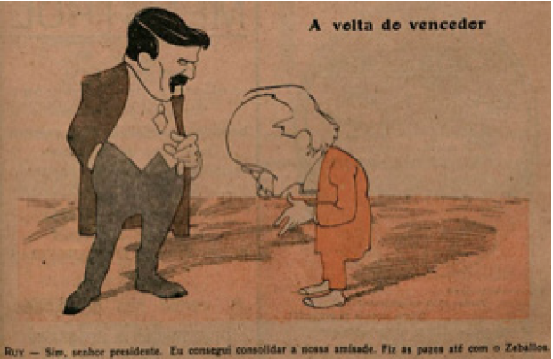 En esta ocasión, la “redención” de Zeballos ante el Brasil fue facilitada por el periodista Sertorio de Castro quien presenció el primer encuentro entre los dos juristas en el Hotel Plaza, y luego efectuó una entrevista al argentino en su propia casa que describió en los términos más elogiosos52. Con todo, pese a las explicaciones brindadas, diversos órganos de prensa, como la revista Careta, resucitaban incesantemente el incómodo prontuario del ex ministro argentino en sus relaciones con Brasil. A todo esto, vino a añadirse enseguida un nuevo escándalo. El senador Vitorino Monteiro y el diputado Gumercindo Ribas, ambos representantes de Rio Grande do Sul, clamaron en sendas cámaras porque Barbosa no le objetó a Zeballos el uso de la expresión “último caudillo” cuando se refirió públicamente al malogrado gaucho Pinhero Machado durante la presentación que hiciera de su invitado en el Instituto Popular de Conferencias. El jurista embajador y el jurista anfitrión, nuevamente, escribieron notas en su defensa53.