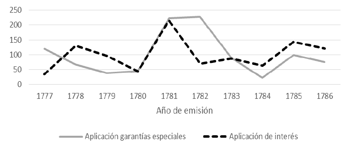 De este modo, es claro que aquel incremento de la morosidad desde el estallido de la rebelión conllevó correlativamente un incremento de la apelación a garantías especiales y a la aplicación de tasas de interés definidas contractualmente, como puede observarse en la Gráfica 9. De igual modo, se advierte una disminución en la aplicación de interés y en la recurrencia a garantías hipotecarias cuando desde 1784 la morosidad disminuye.