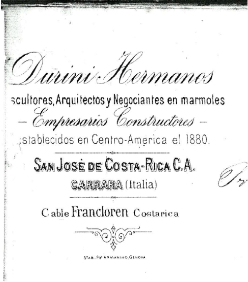 31Santamaría y Oviedo, “Los hermanos Durini y las Casas de Corrección en Costa Rica”, p. 34. Cf. Cifuentes, “Las esculturas de la Avenida Reforma como medio de identidad histórica guatemalteca”; Pino, Los Durini: Artífices del rostro moderno de Quito. Análisis de la arquitectura en un marco socio-histórico; Fishel, El Teatro Nacional de Costa Rica: su historia; González, “La impronta italiana en las esculturas del Cementerio General de Guatemala (1881-1920)”; Gutiérrez, “Carrara nell’America Latina e creazione scultorea”; Gutiérrez, “Presencia de Italia en la pintura y la escultura de los países sudamericanos durante el siglo XIX”; Torrejón, “Escultura monumental pública de Tegucigalpa”, Valdés, “Masones, liberales y ultramontanos salvadoreños: debate político y constitucional en algunas publicaciones impresas, durante la etapa final del proceso de secularización del Estado salvadoreño (1885-1886)”.