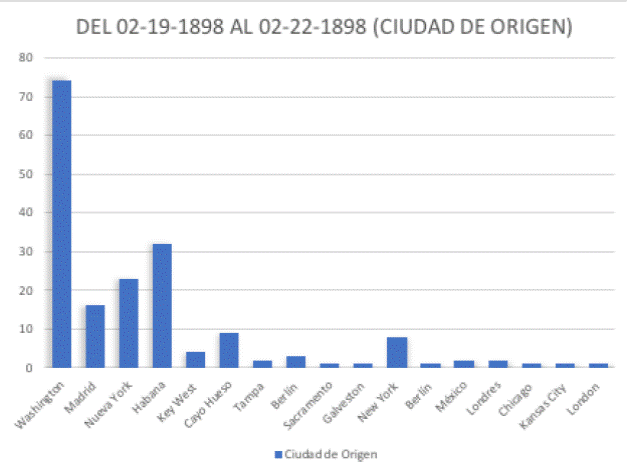 En segundo lugar, apuntamos que la inmensa mayoría de las noticias publicadas eran telegramas. De manera que fue posible interrogar a la fuente sobre el lugar y fecha de origen de la información. Esto nos interesó de sobremanera para explorar de dónde y a través de qué canales salieron y circularon las noticias, pues queríamos saber si el origen y el canal informativo repercutieron en el contenido de las noticias, pues a pesar de que el telegrama se presentaba como un medio objetivo e imparcial, su uso no lo era y no lo es. Entre los resultados que presentamos queremos destacar que la mayoría de los periódicos mexicanos publicaron cables cuyo origen remitió a Washington. Le siguieron en orden de preponderancia: La Habana, New York, Madrid y Key West. ¿Cómo era posible que la mayoría de las fuentes de información de la prensa capitalina sobre un evento ocurrido en Cuba se originaron en ciudades norteamericanas? Este hecho se debió a factores tales como, el sobrado interés de parte de los diarios norteamericanos por seguir con detalle el suceso, al sistema telegráfico dominado por Estados Unidos sobre México y el Caribe y, al progresivo cierre y control de las informaciones de parte de las autoridades estadounidenses.