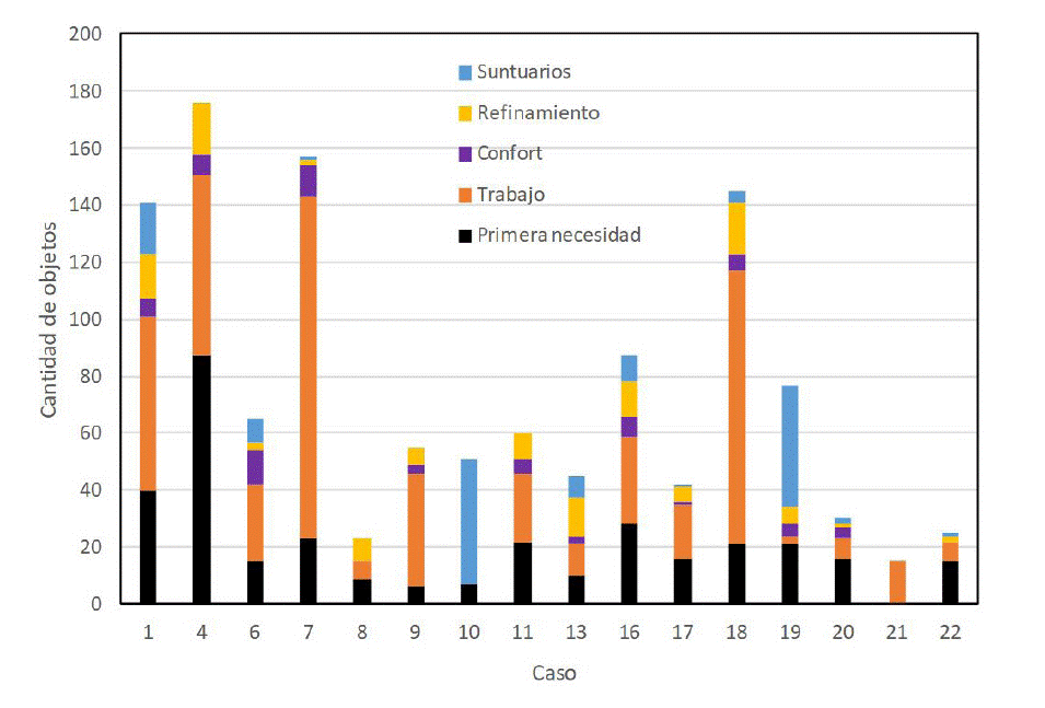 34Los objetos listados en los inventarios por pares o por medidas de cantidad como docenas, o en cantidades no claras, fueron considerados como un solo objeto. Por ejemplo, “un par de estribos” se consideró como un único objeto, así como también, por ejemplo, “una docena y media de cueros”, “unas arganas nuevas”, “un juego de hierro de colchar con sus tablas y piña”, “unas argollas de hierro viejas”, “dos cargas de bejuco”, “una navaja de ocho piezas”, “una escribanía compuesta de cuatro piezas”.