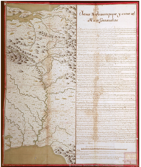 Figura 1 Agustín Crame, “Ystmo de Tecoantepeque y curso del río Goazacoalcos”, México, 18 de marzo de 1774, AGI, Sevilla, Mapas y Planos México, núm. 302.