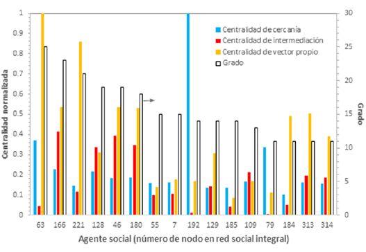 | Agente social* | Grado | Grado ponderado | Grado de entrada ponderado** |