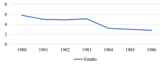 En este orden de cosas, también era importante el impacto de la cotización del estaño en la Bolsa de Londres, principal referente nominal de uno de los principales minerales de la canasta exportadora boliviana. El estaño explicaba más de la mitad de las exportaciones del país al menos hasta 1985 que comenzara a perder posiciones que lo dejarían en torno al 30% de las mismas. El país, que estuvo en todo el siglo XX entre los primeros productores de estaño a nivel mundial y que había industrializado la actividad con la Revolución de 1952, vio fluctuar el precio de este bien imprescindible para la industria. Así, como puede verse en el Figura 5, el precio del estaño se encontró durante la mayor parte de los años analizados en precios históricamente bajos, que no volvieron a superar los 10 dólares de antaño, menos aún los más de 30 dólares por libra que había alcanzado en décadas anteriores a los años ochenta.