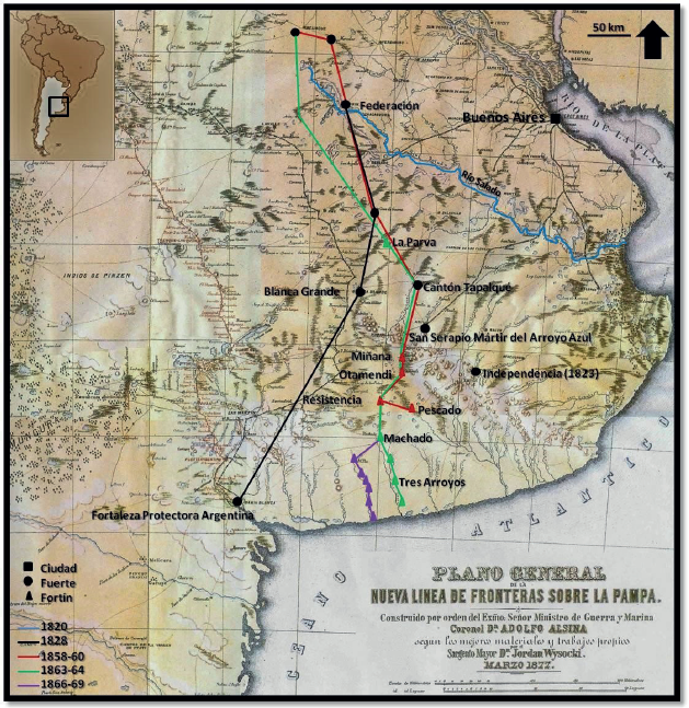 Figura 1 Fuertes, fortines y líneas de fronteras con énfasis en la Frontera Sur de Buenos Aires.