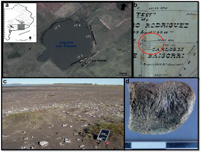 Figura 3 Sitio arqueológico Las Toscas 3. a. Ubicación, b. Detalle del duplicado de mensura N° 63 del partido de Tres Arroyos (1875), en el círculo rojo arriba de la laguna se registra el puesto “Chorroarin”, c. Vista general del sitio y d. Hueso sesamoideo de Bos taurus con marcas de corte de objeto metálico (pieza 1644).