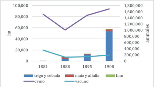 Como adelantamos en la introducción, en Buenos Aires la mala performance de la agricultura comenzó a revertirse en el último cuarto del siglo XIX y en el sur obedeció al aumento de la superficie sembrada con trigo. Si bien para 1895 la agricultura era aún una actividad incipiente y con menos peso que la ganadería, nos interesa mostrar el punto de partida de una zona que, como se observa en el gráfico, en pocos años crecería exponencialmente.