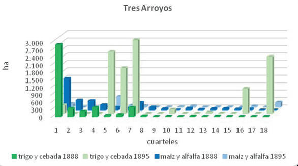 Con los datos del censo provincial de 1888 y nacional de 1895 podemos observar el panorama agrícola del partido en el último cuarto del siglo XIX; como en ambas estadísticas los datos se presentaron por cuarteles pudimos compararlos. En el primer año el partido de Tres Arroyos había sido dividido administrativamente en 16 cuarteles que incluían 153 explotaciones, mientras que en 1895 había 18 cuarteles con 187 explotaciones. El Gráfico 2 muestra cómo se distribuyó espacialmente la agricultura y los cambios que se fueron sucediendo en este lapso. En el primer año, la distribución por cuartel muestra que existía una especialización al interior del partido, puesto que el 90% del total de hectáreas sembradas con cereales finos, y el 70% de las sembradas con maíz y alfalfa, se ubicaban en los cuatro primeros cuarteles donde, además, no había ganado. Esto fue así porque en 1885 se trazó el ejido, su mensura muestra que la superficie fue dividida en quintas de 100 x 200 m2 y chacras de 50 ha. Por fuera de este radio, solo el cuartel rural 7° tenía un porcentaje considerable de hectáreas cultivadas (véase Registro Gráfico Anexo).