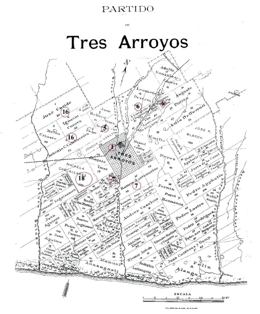 El caso de Ramón Santamarina es bien conocido por el exhaustivo estudio de Andrea Reguera (2006); llegó a Argentina desde Galicia y en 1844 se instaló en Tandil para trabajar como peón de estancia. Por los contactos que creó en Buenos Aires, inauguró el primer servicio de carretas que cubría el tramo Tandil-Buenos Aires abasteciendo de productos los almacenes y fortines de la frontera. Gracias a esta actividad fue acumulando un gran capital que invirtió en tierras. Llegó a tener 281.727 ha en la provincia de Buenos Aires repartidas en diferentes partidos. Entre 1873 y 1901 adquirió en Tres Arroyos más de 49.102 ha.70 En el año del censo sus tierras se ubicaban en los cuarteles 1°, 7°, 13° y 17°. De acuerdo al estudio de Reguera (2006), los establecimientos de Santamarina eran “mixtos”, en general alternaban producción agrícola con ganadera (invernada y cría) para el mercado. La comercialización interna se hacía tanto desde la casa de negocios que Santamarina tenía en Buenos Aires, como en las mismas estancias a través de ventas a particulares o consignaciones. En el cuartel 7° los Santamarina tenían la estancia “Dos Anas” y cuatro parcelas agrarias sin cultivo.71 Mientras que en el cuartel 13° se encontraba la estancia “La Elena” y en el 17° “San Jorge”.