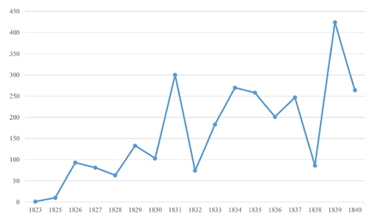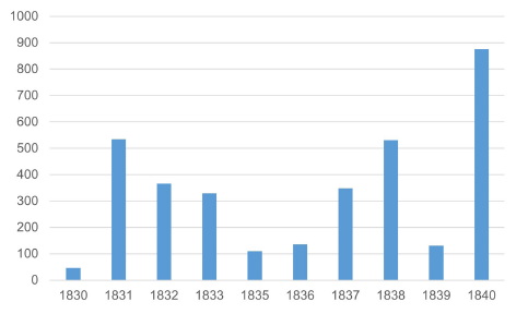 En la Figura 2, se aprecian las solicitudes de cartas de seguridad hechas por franceses de manera anual entre 1830 y 1840, que alcanzaron un total de 3 437. Como suele ocurrir en este tipo de fuentes, aparecen subregistros. Es de notar que el año de 1840 cuenta con el mayor número de solicitudes de cartas de seguridad debido a la estabilidad en las relaciones franco-mexicanas, después de las desavenencias suscitadas en 1838 y 1839.
