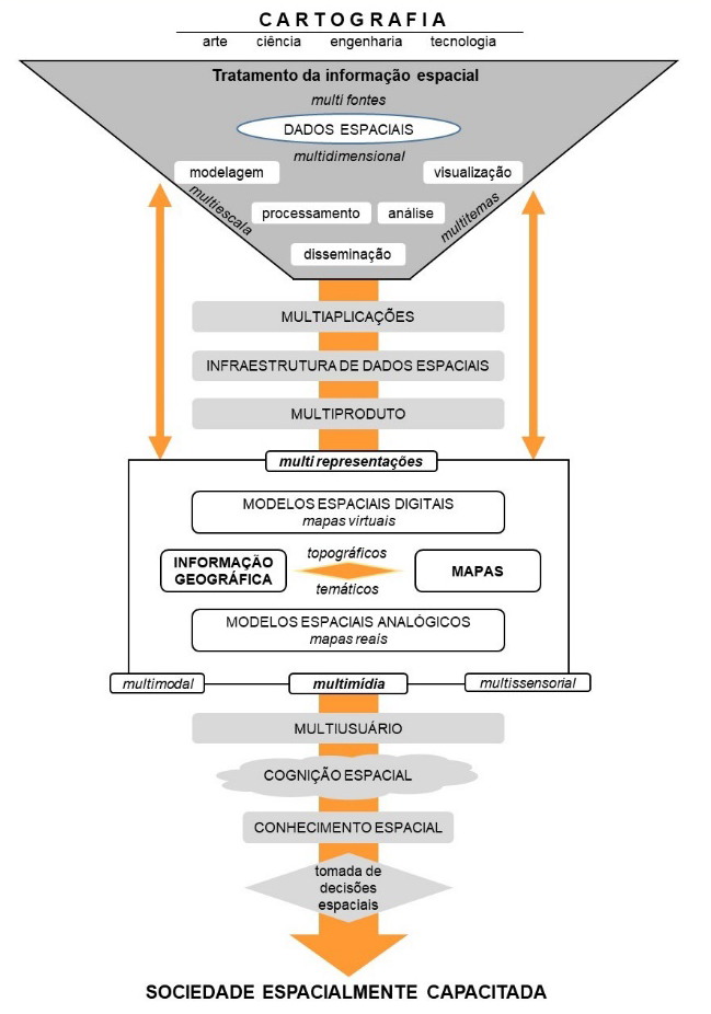 En la Figura 1, el autor presenta el campo de la cartografía, en un intento de identificar y desarrollar un cuadro teórico actual y amplio para la cartografía, revisitando conceptos, técnicas y paradigmas e investigando sus relaciones con el tratamiento y uso de las informaciones espaciales. Se nota la repetición de la palabra “multi” en las diversas etapas, lo que va al encuentro de las ideas de los autores y de las propuestas de una cartografía inclusiva, multisensorial, multimodal e interactiva, también en el sentido de alcanzar una sociedad espacialmente capacitada. Para Basaraner (op. cit.), la cartografía es una disciplina espacial esencial para la Tierra y para la sociedad que precisa y merece ser identificada en un contexto más amplio, con todas sus aplicaciones.