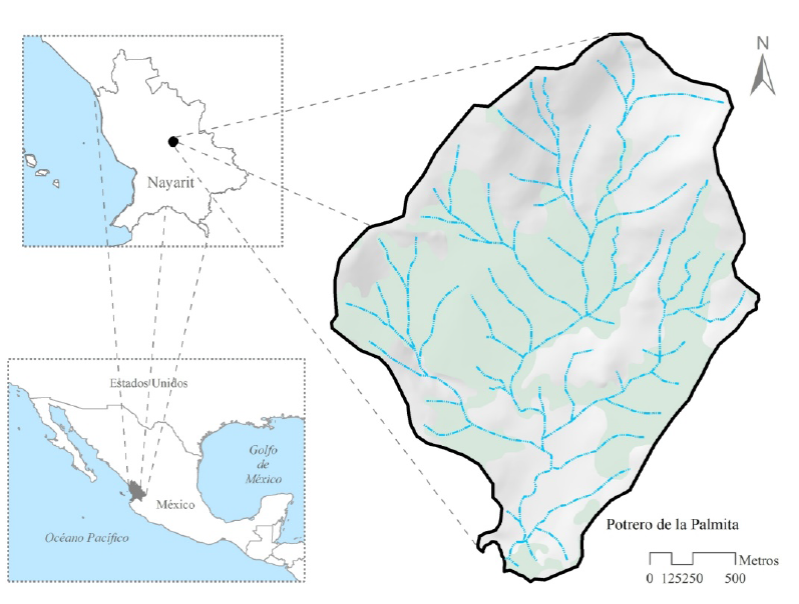 En la microcuenca Potrero de la Palmita, habita el grupo étnico wixárika o huichol (etnia de la región centro-oeste de México), el cual es reconocido administrativamente por el gobierno del municipio del Nayar como la localidad Potrero de la Palmita, quedando asentada cerca de la desembocadura de la microcuenca, zona donde vierte sus aguas al Río Huaynamota. Se sitúa entre los 752 y 210 msnm, resaltando elevaciones como el Cerro Cuate (540 msnm) y Peñasquillo (740 msnm), (Figura 1).