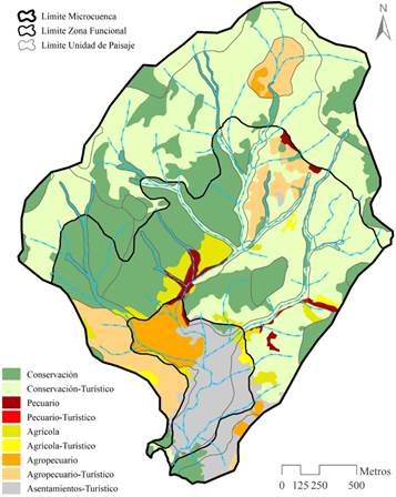 A partir del conocimiento del estado socioambiental de las unidades de paisaje físico-geográfico, se identificaron los usos de suelo principales, secundarios y terciarios, definiendo su compatibilidad, proponiendo nueve diferentes usos para optimizar el uso del suelo dentro de las zonas funcionales de la microcuenca (Tabla 8).
