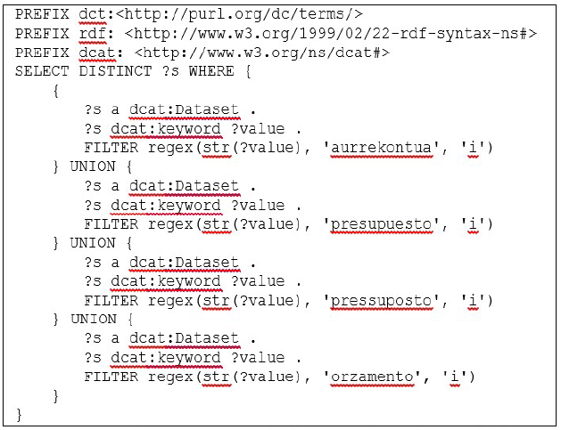 Por tanto, se optó por filtrar finalmente aquellos conjuntos de datos que contuviesen la palabra clave “presupuesto” en cualquiera de los idiomas oficiales de España. En la Figura 4 se muestra la consulta SPARQL utilizada para identificar las URI de todos los conjuntos de datos relacionados con presupuesto.