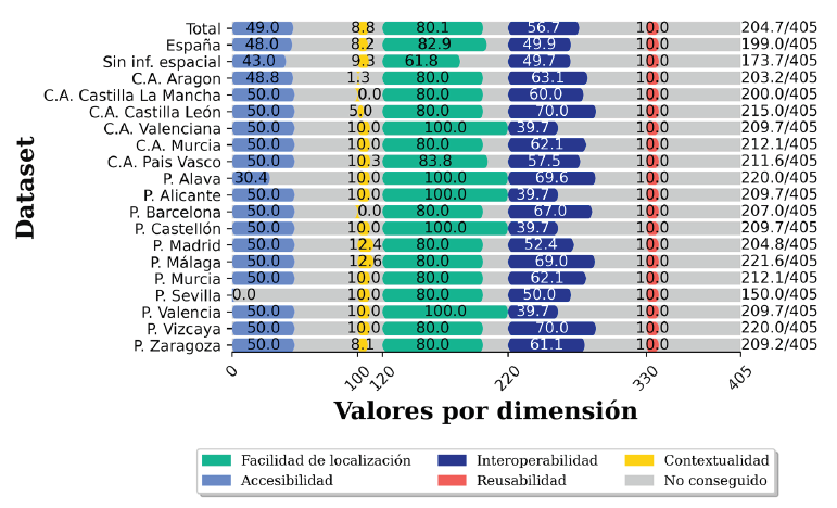 En primer lugar, es necesario recordar que, tras la separación de los metadatos en los diferentes territorios, algunos de los conjuntos tienen menos de 10 registros, concretamente: las Comunidades Autónomas de Castilla-La Mancha, Castilla y León y la Comunidad Valenciana, además de las provincias de Alicante, Barcelona, Castellón, Sevilla, Valencia y Zaragoza (aunque ésta última dispone de nueve registros). Sin embargo, estos conjuntos de metadatos pueden tener un mayor número de comprobaciones para algunas de las medidas de cada dimensión porque provienen de propiedades multivaluadas, por ejemplo, el campo de formato (dct:format) es evaluado en un número mayor de ocasiones en múltiples metadatos.